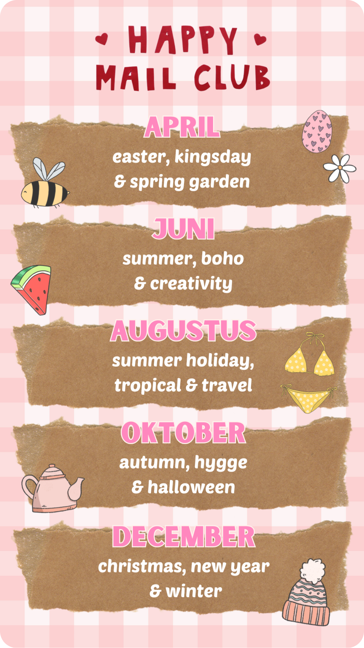 The Happy Mail Club is now available once every two months, with themes that perfectly match that period. This allows more time to put together each package with extra care and creativity! ✂️