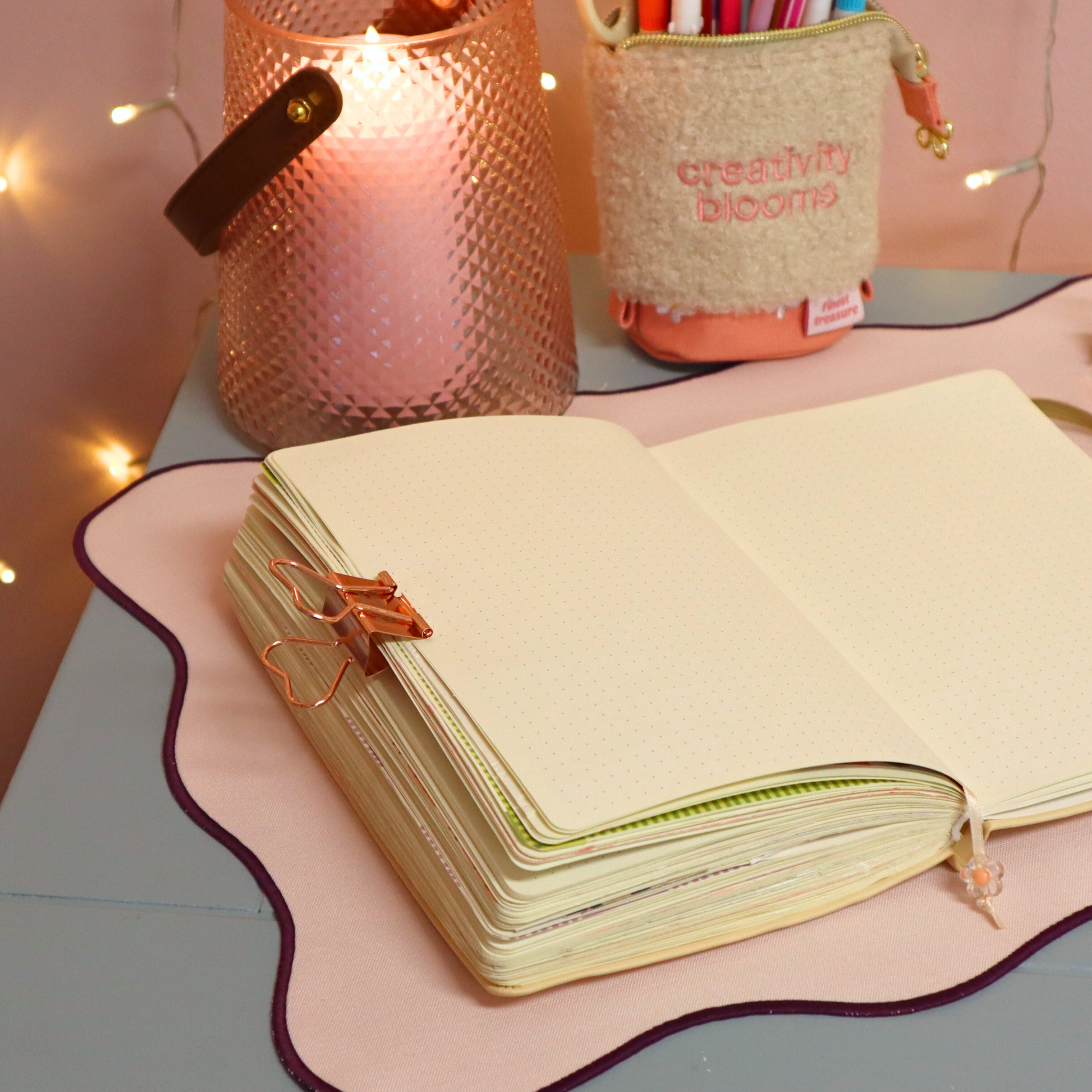 Deze journal clip van Fines Treasure houdt je pagina’s netjes bij elkaar en heeft een hartvormige design in warm roségoud. Zodra je journal wat voller wordt en je voorbij de helft bent, blijven je pagina’s ineens liever omhoog staan dan plat liggen. En dan komt deze clip perfect van pas! Klem ’m vast en je journal blijft netjes open liggen terwijl jij schrijft, plakt of tekent.